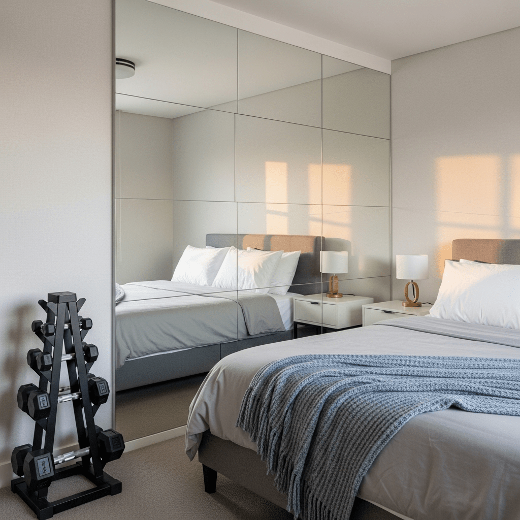 Install a wall of floor-to-ceiling mirrors. Not only is this essential for checking your form during a workout, but it also reflects light and doubles the perceived size of the room, making a small guest bedroom feel like a spacious suite.