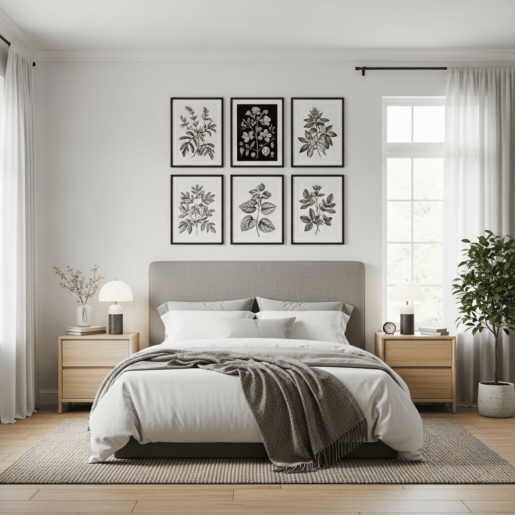 Skip expensive art prints and create a gallery wall using your own travel photos or botanical clippings from your backyard. Use affordable, uniform frames from a craft store to create a high-end, cohesive look.