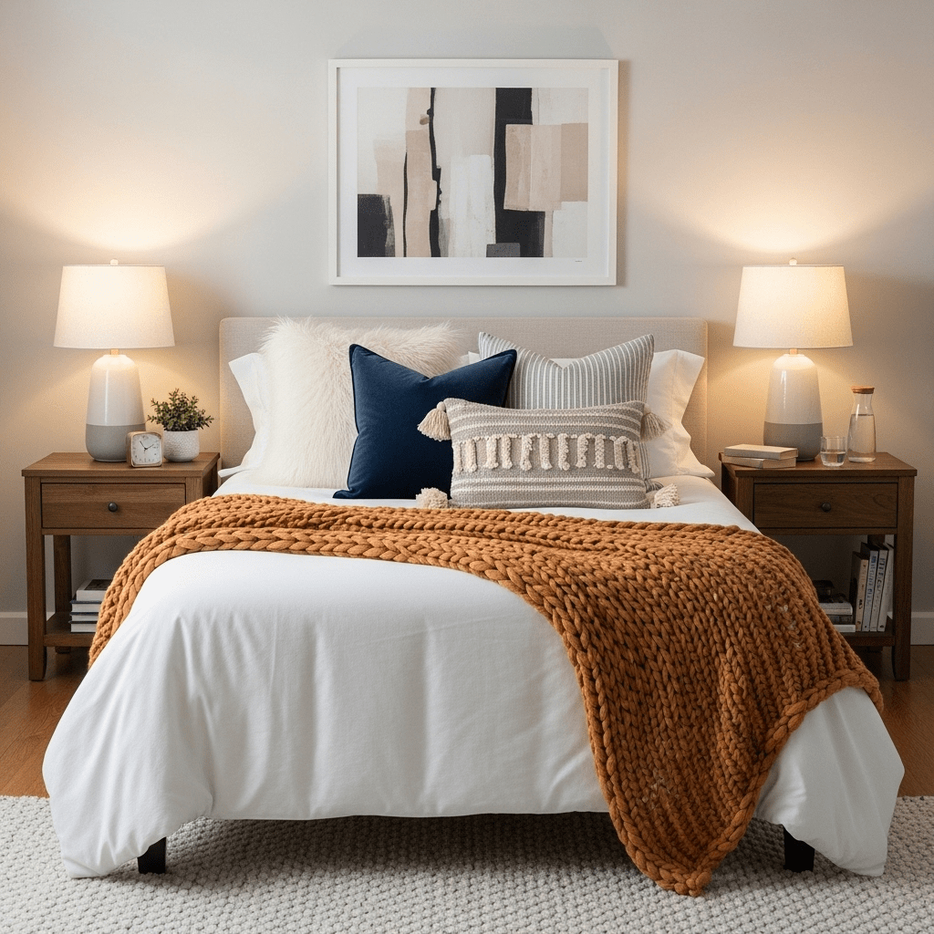 Visit discount home stores or thrift shops for high-quality wool throws or decorative pillow covers. Mixing textures like linen and cotton makes the bed look expensive and inviting.