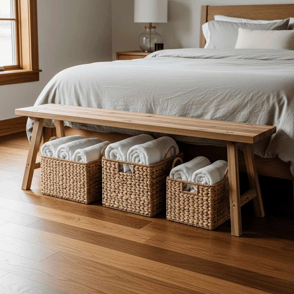 Instead of installing a closet system, use affordable woven baskets to hold extra towels, blankets, and guest toiletries. It adds a rustic, tactile element while keeping the room organized.