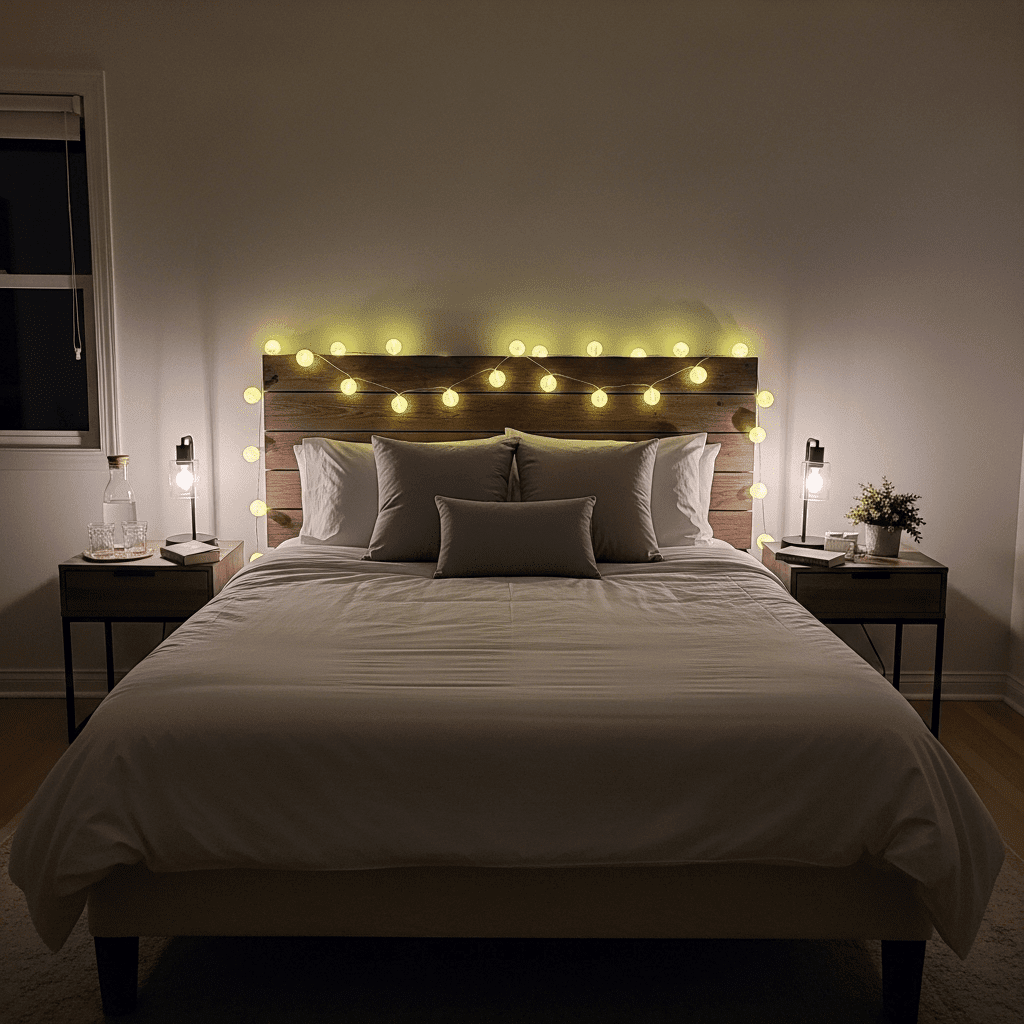 Twinkle lights or “fairy lights” draped over a headboard or window frame add a warm, magical glow for just a few dollars. They create a cozy atmosphere that guests will love.