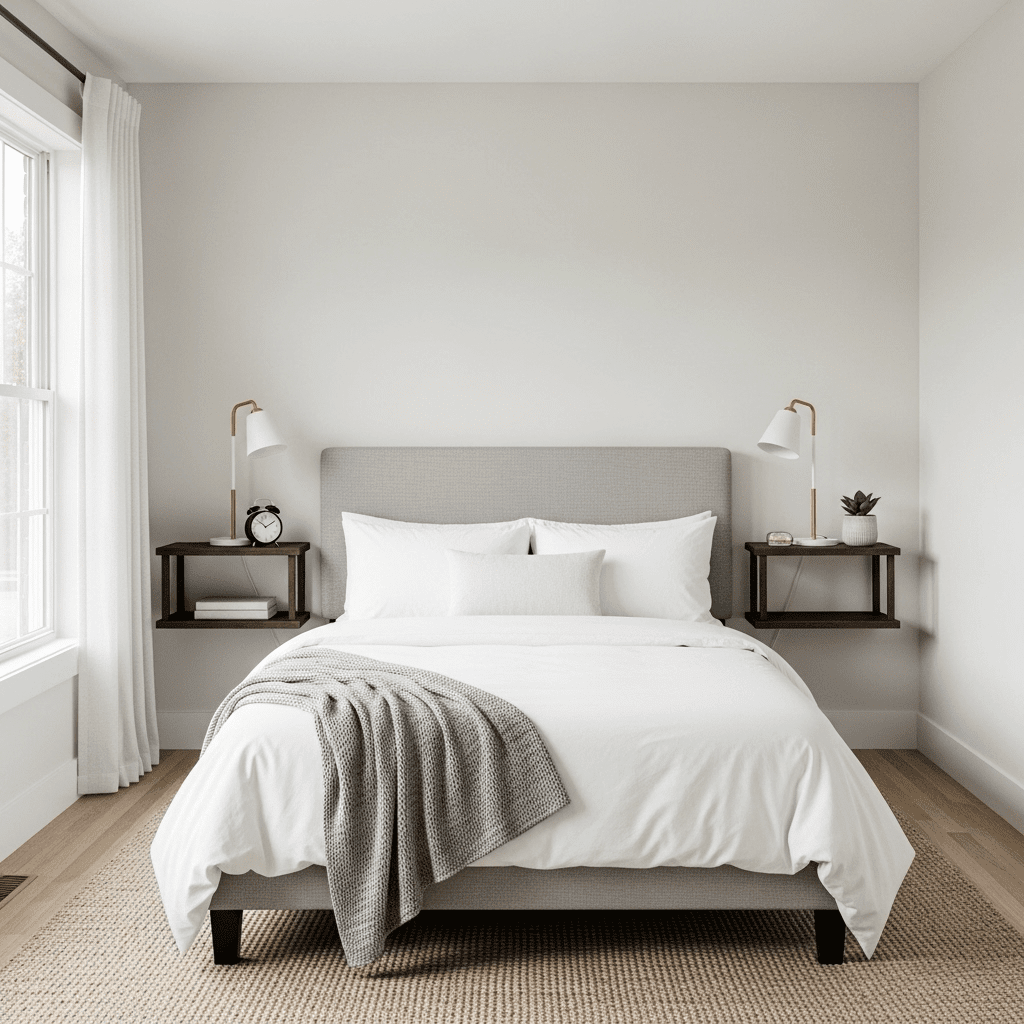 If the room is tight and the budget is tighter, use simple L-brackets and a piece of scrap wood to create floating bedside shelves. This saves floor space and keeps costs to a minimum.