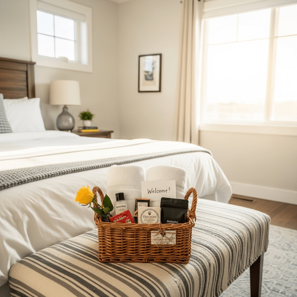You don’t need to shop at luxury boutiques to welcome your guests. A simple basket with a few snacks, bottled water, and a handwritten Wi-Fi password makes a huge impact.