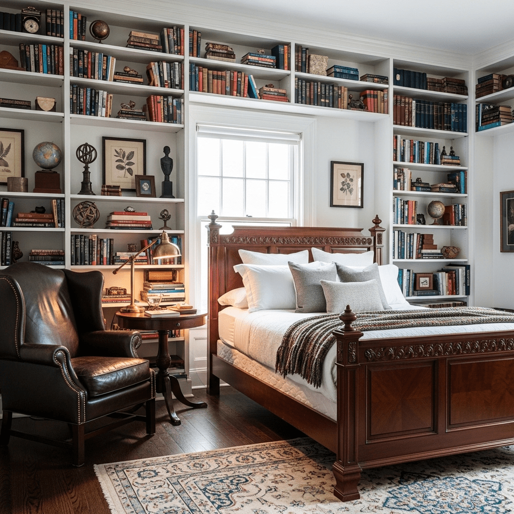 For guests who love to read, turn the room into a scholarly sanctuary. Use dark wood shelving, a leather armchair, and deep green or burgundy walls to create a quiet, intellectual atmosphere.