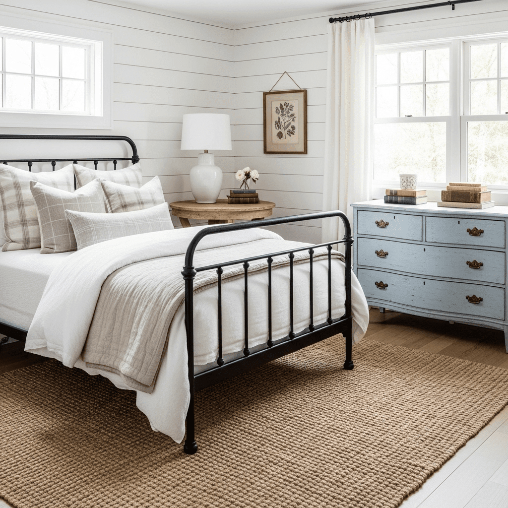 Create a classic, rustic feel with horizontal white shiplap walls and a black iron bed frame. This look is timeless, clean, and evokes a peaceful countryside atmosphere.