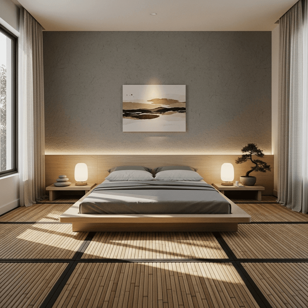 Embrace minimalism with a platform bed that sits low to the ground. Use sliding paper screens and a palette of grey, sand, and black to create a meditative, quiet space.