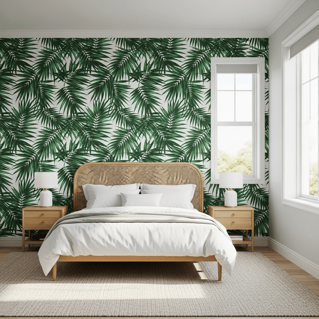 Bring the vacation home with large-scale palm leaf wallpaper. Pair it with light rattan furniture and white linens to make your guests feel like they’ve woken up in the Caribbean.