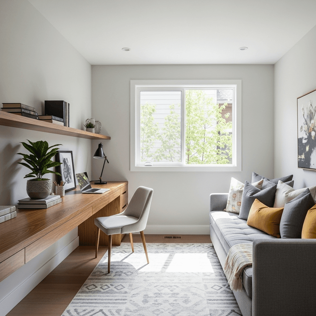 In smaller homes, combine a guest room with a home office. Use a sleek daybed that looks like a sofa during the day, making the workspace feel professional until it’s time for bed.