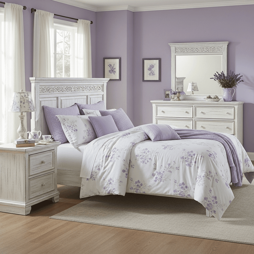 Use soft pastels, distressed white furniture, and floral linens to create a romantic, European-inspired space. It feels airy, light, and very traditionally welcoming.
