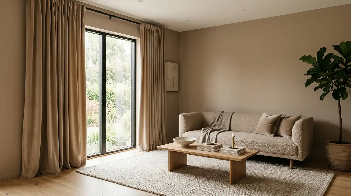 Match your beige curtains exactly to your mushroom or taupe wall paint. This eliminates visual borders, making the room appear significantly larger while creating a seamless, cocoon-like sanctuary.