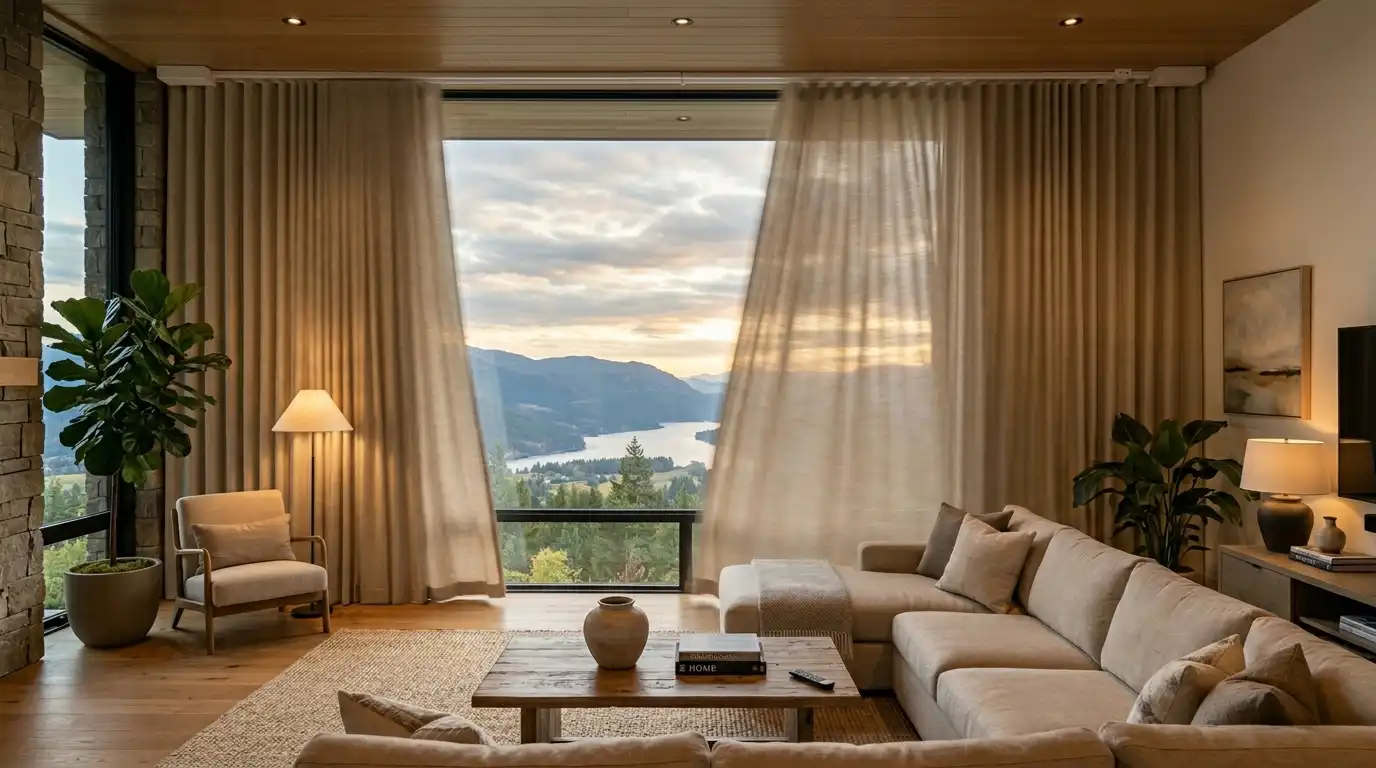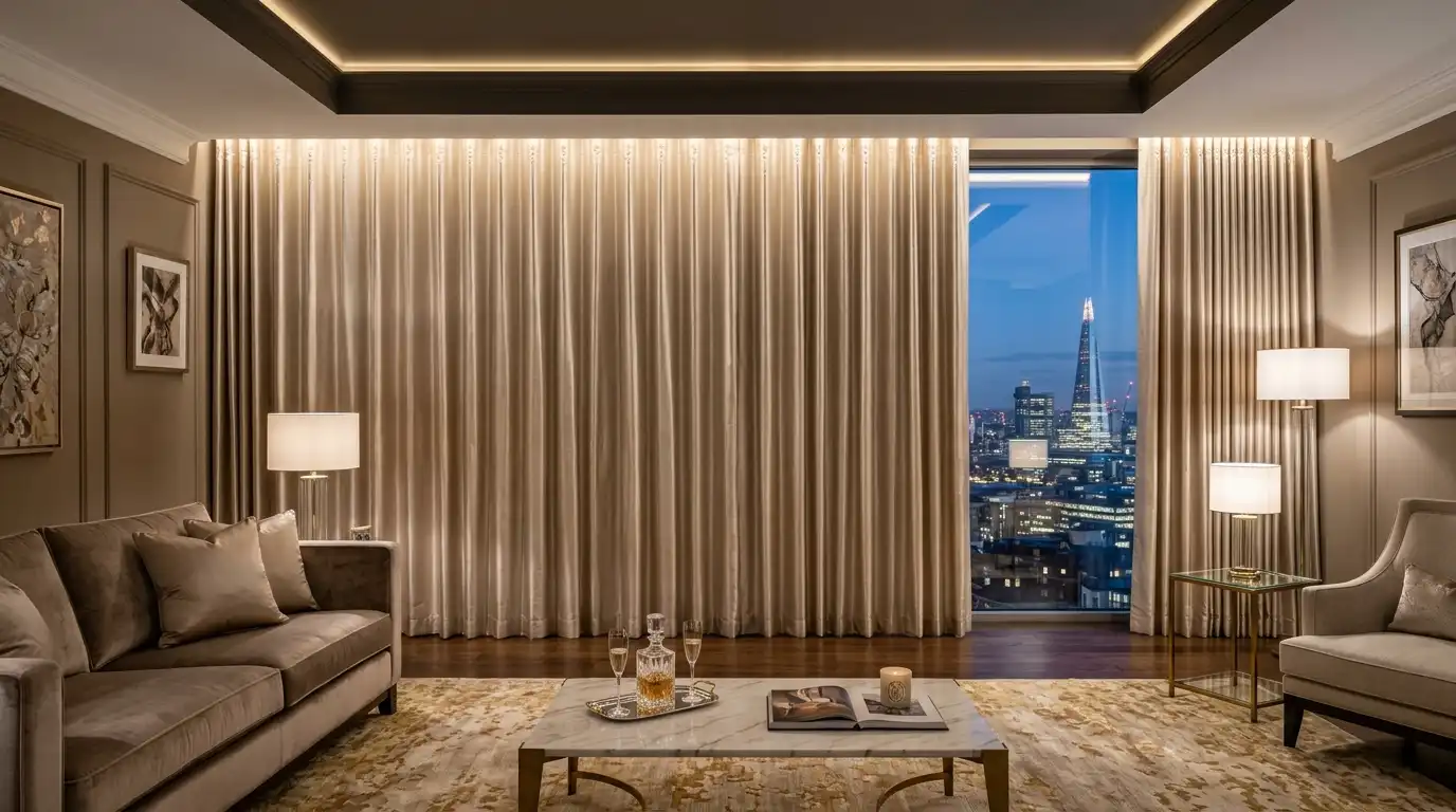 Install a motorized track for heavy beige blackout drapes. The ability to transition your sun-drenched lounge into a private, light-blocked suite via a smartphone is the ultimate modern convenience.