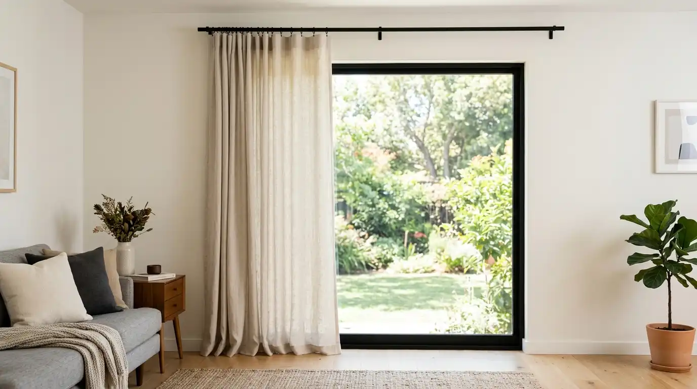 Pair light cream-beige drapes with a thin, matte black rod. This “graphic” frame prevents the neutral fabric from disappearing into the wall and adds a sharp, contemporary edge to the window.