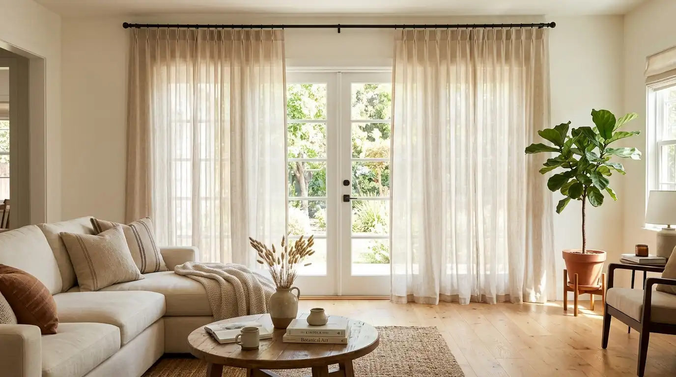 Instead of white, use a beige-toned sheer panel. This filters the afternoon sun into a warm, sepia-toned light that feels much cozier and more inviting than a stark white glow.