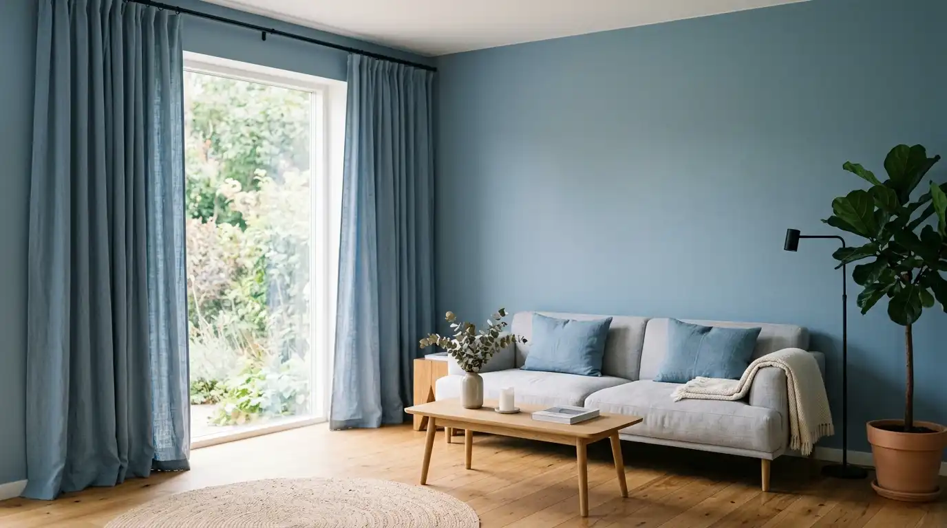 Match your dusty blue curtains exactly to the shade of your blue-grey walls. This eliminates visual boundaries, making the room feel like a seamless, continuous sanctuary of sophisticated, calming color.
