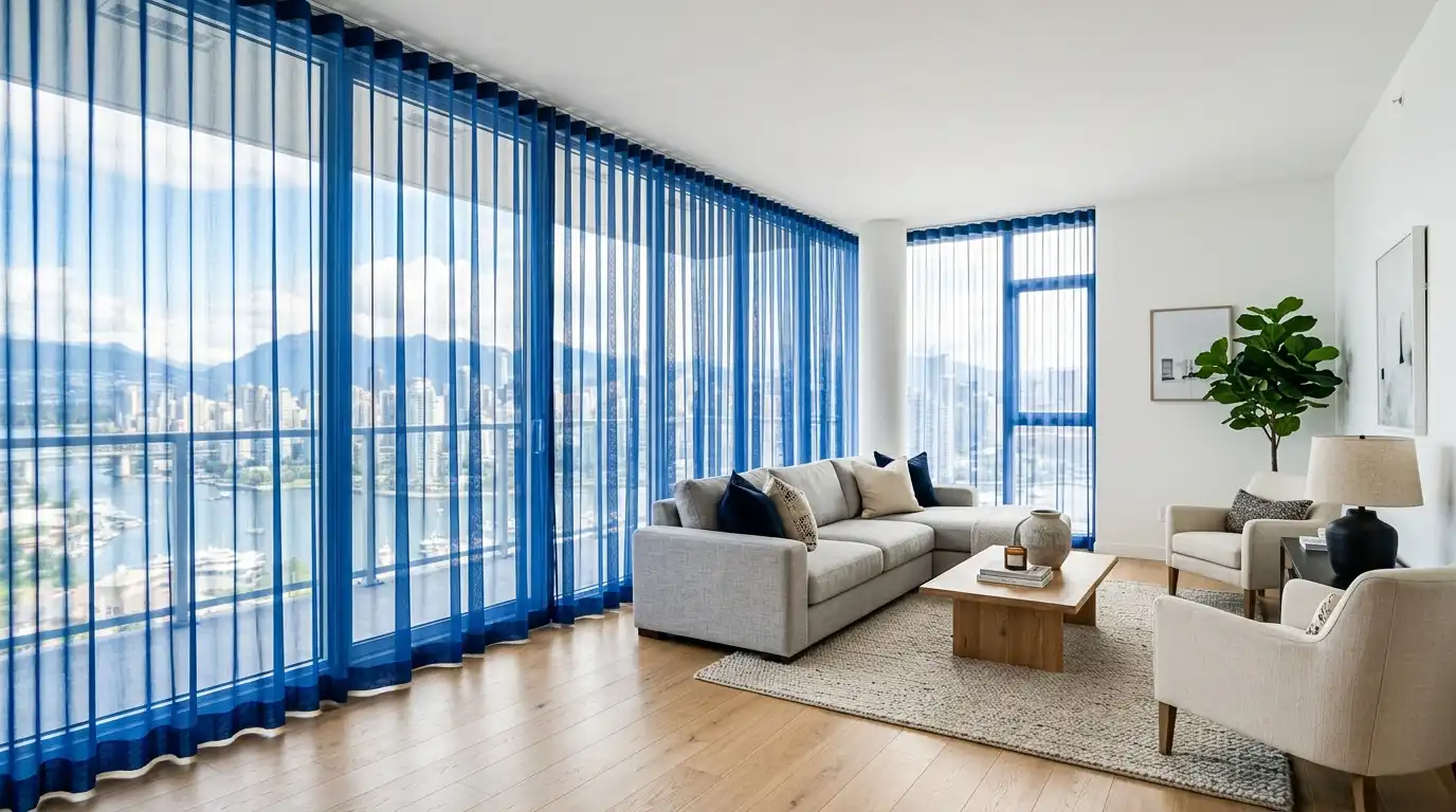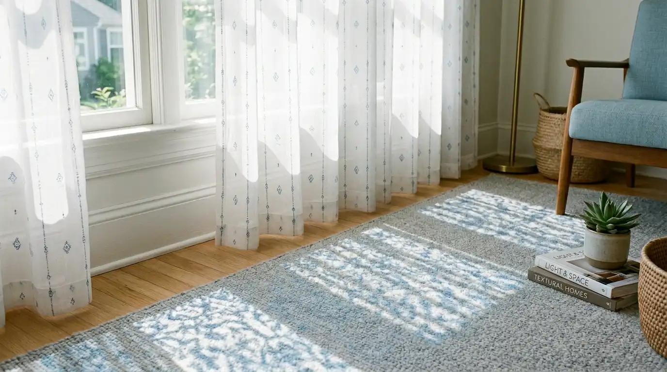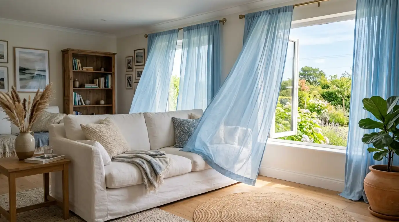 Opt for light, open-weave linen in a soft sky blue. This filters the afternoon sun into a cool, airy glow that mimics the horizon line, making the living room feel fresh and perpetually reminiscent of a seaside retreat.