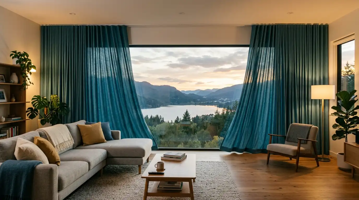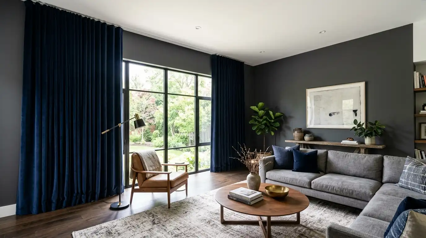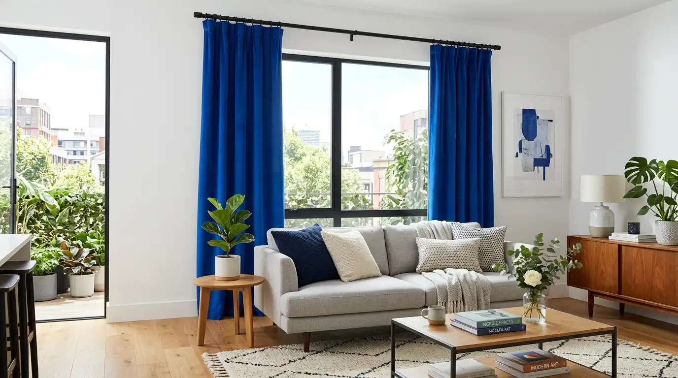 Pair vibrant cobalt blue drapes with a thin, matte black minimalist rod. This “graphic” combination feels grounded and modern, providing a sharp architectural frame for the view outside.