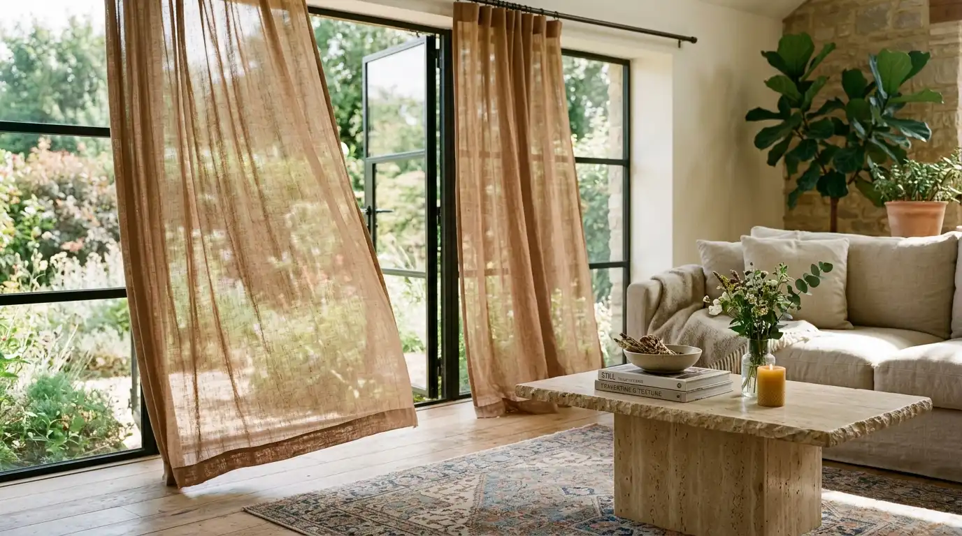 Opt for light, open-weave linen in a tobacco or “camel” tone. This filters the afternoon sun into a warm, golden haze that mimics the “golden hour” light, adding a layer of organic warmth to a minimalist, white-walled room.
