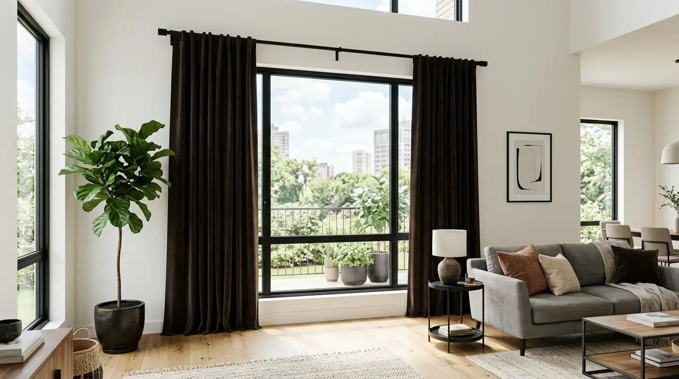 Pair rich chocolate brown drapes with a thin, matte black minimalist rod. This “graphic” combination feels grounded and modern, providing a sharp architectural frame that coordinates perfectly with industrial light fixtures.