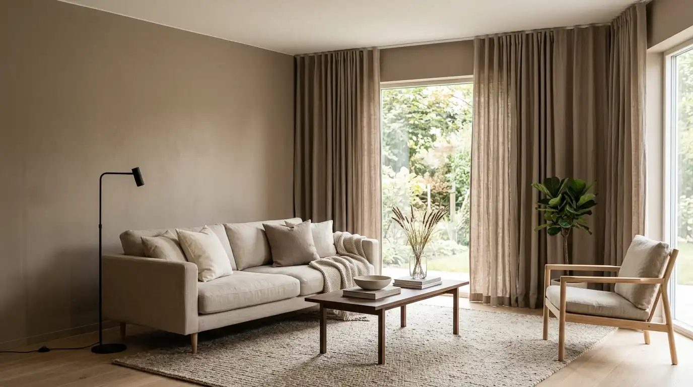 Match your mushroom-brown curtains exactly to the shade of your walls. This “color-drenching” technique eliminates visual boundaries, making the room feel like a seamless, continuous sanctuary of sophisticated, calming earth tones.