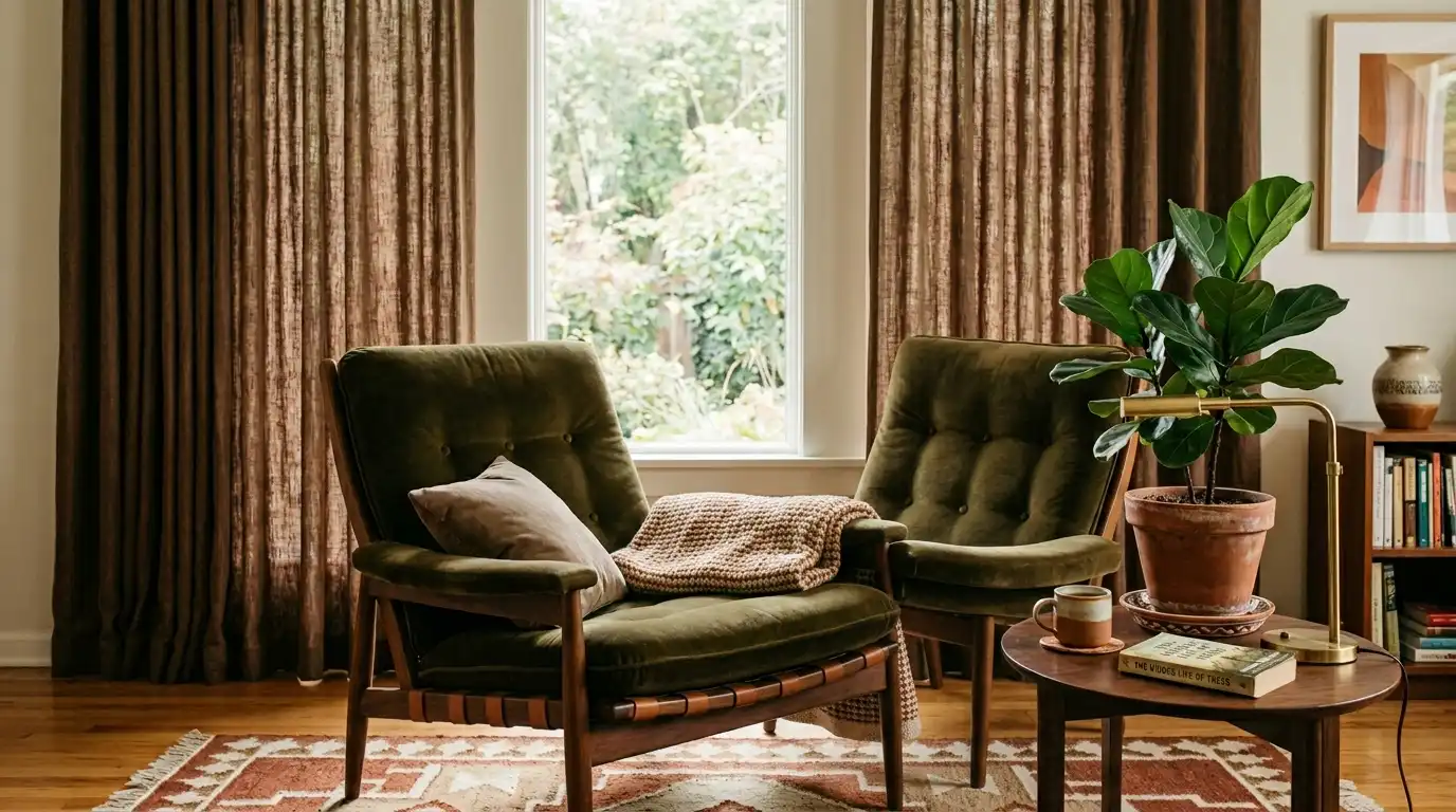 Choose a heavy, matte espresso brown velvet to add a sense of academic weight and luxury. The dense pile absorbs light and sound, making this the definitive choice for a moody, executive-style living suite featuring leather furniture and brass accents.