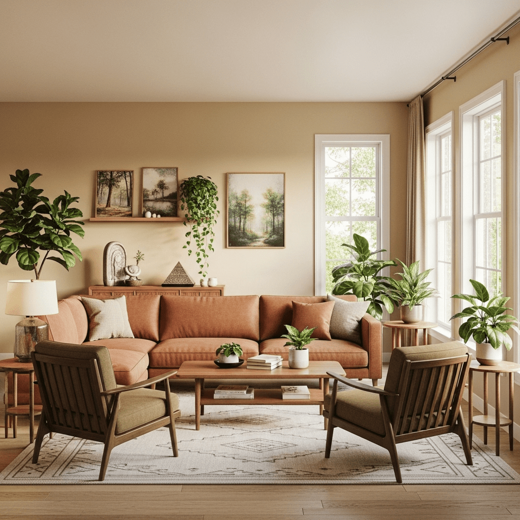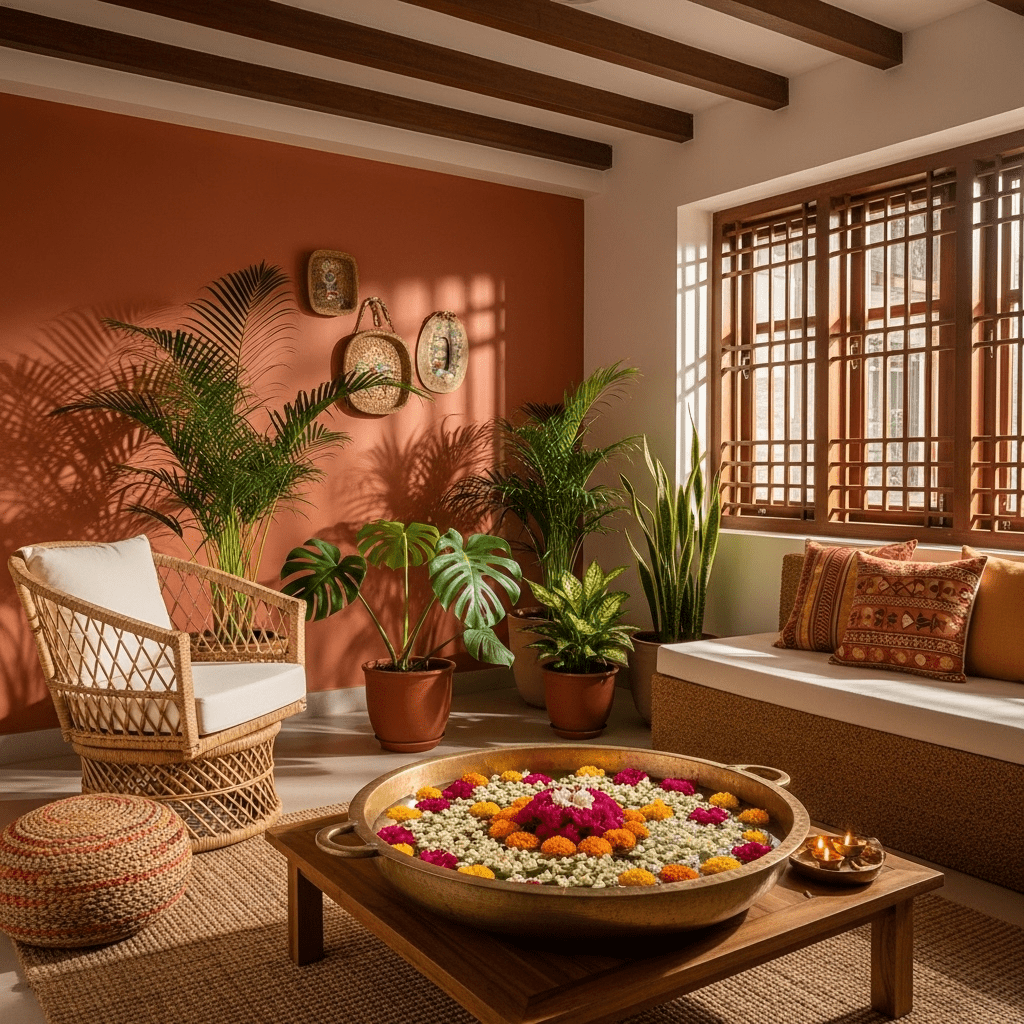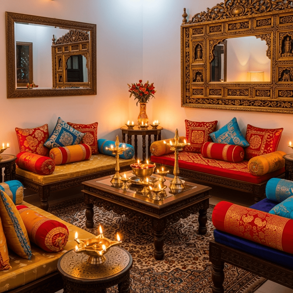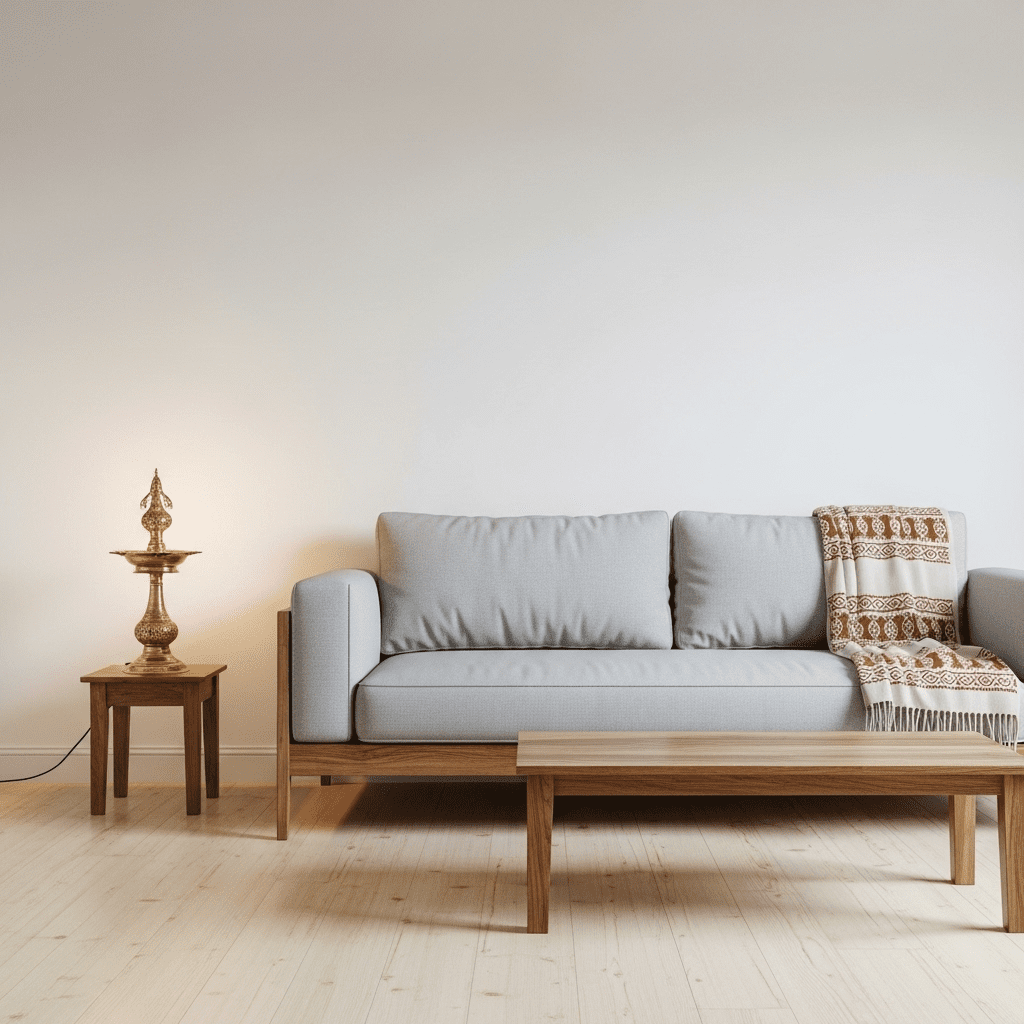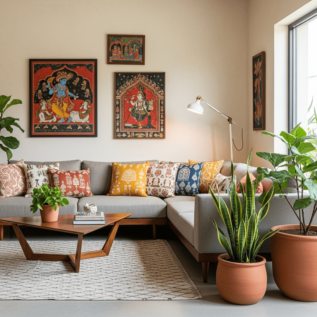 Modern furniture is paired with traditional Indian elements like block-printed fabrics, terracotta accessories, and handcrafted décor. This popular style suits middle-class Indian homes seeking both comfort and cultural connection.