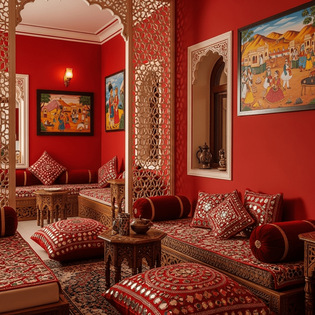 Drawing from Rajasthan’s palatial heritage, this design features rich colors, mirror work, intricate jaali screens, and ornate furniture. Bold jewel tones and luxurious textiles create a regal atmosphere.