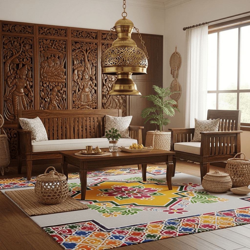 Characterized by dark wood furniture, brass elements, and temple-inspired décor, this style reflects South Indian architectural beauty. Columns, traditional lamps, and rich wooden finishes create warmth and elegance.