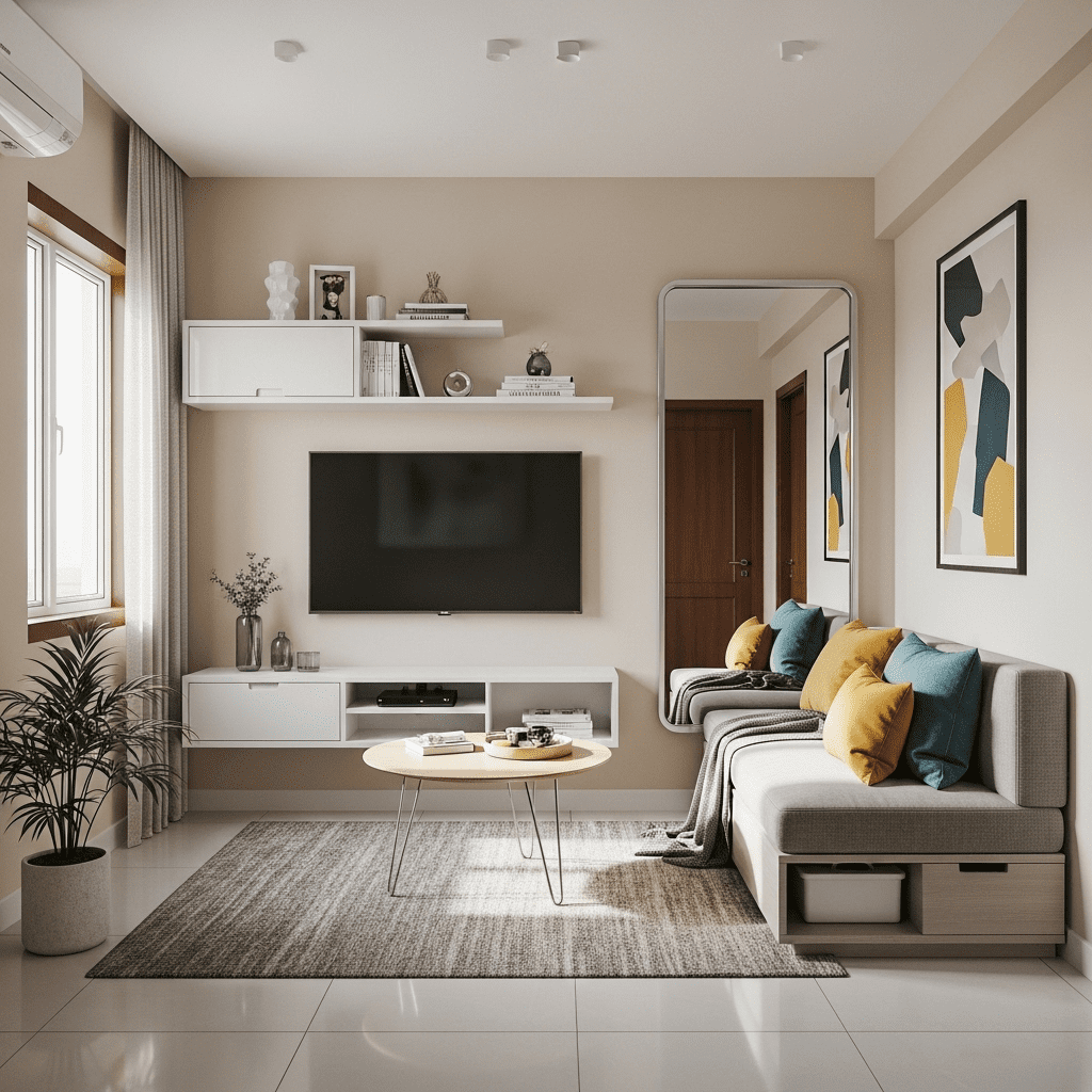 Space-efficient design maximizes small urban living areas common in Mumbai and other metropolitan cities. Multi-functional furniture, vertical storage, and light colors create an illusion of spaciousness.
