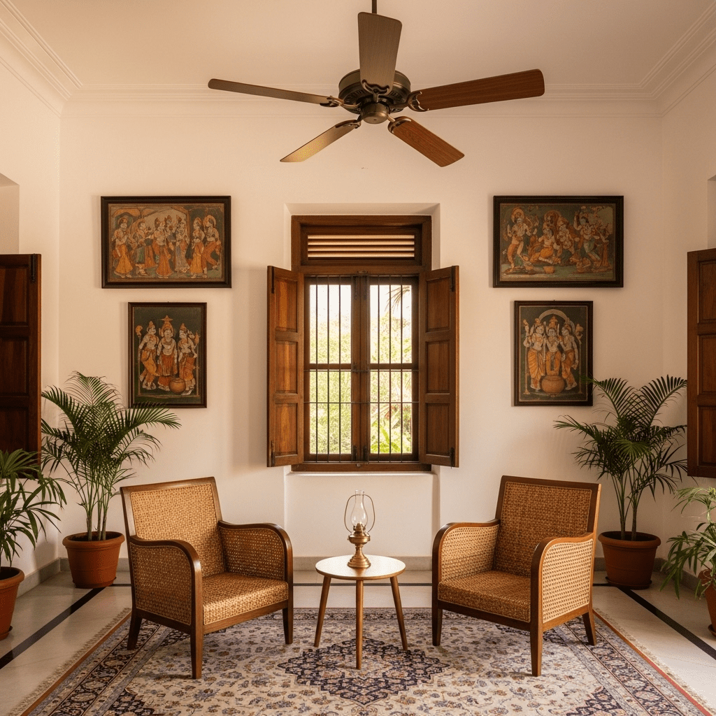 Blending British colonial influences with Indian elements, this design features high ceilings, wooden ceiling fans, wicker furniture, and plantation-style windows. Neutral tones with tropical accents create timeless elegance.