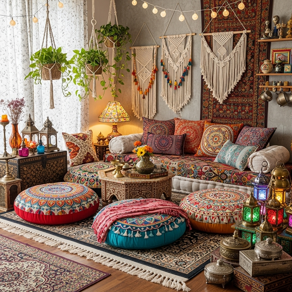 This free-spirited design mixes colors, patterns, and textures from across India. Floor seating, vibrant textiles, hanging plants, and collected artifacts create a relaxed, artistic atmosphere.