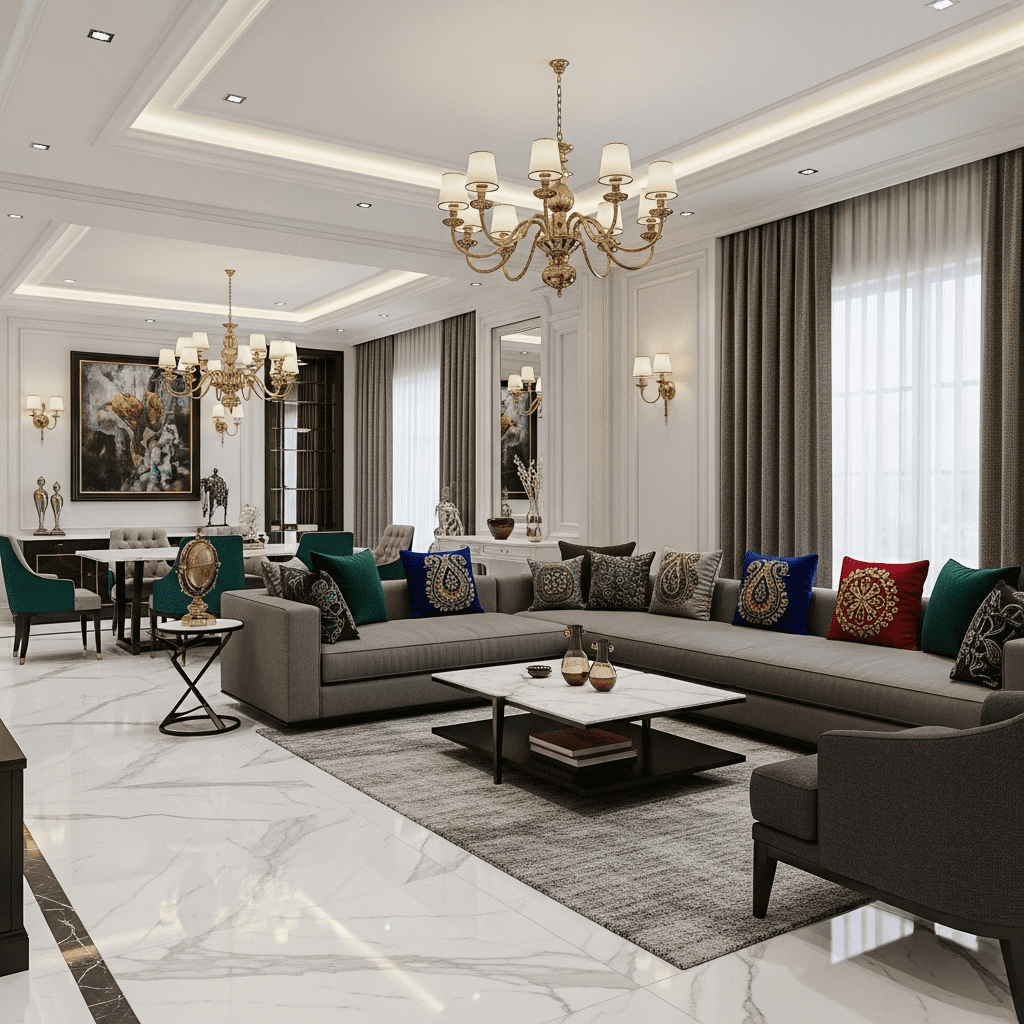 High-end materials meet Indian design sensibilities with Italian marble flooring, designer furniture, custom lighting, and curated Indian art. This style suits upscale urban homes and penthouses.