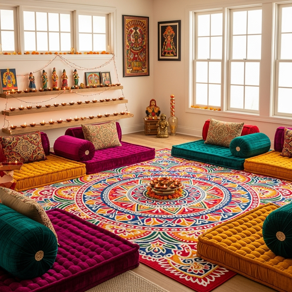 This versatile design accommodates India’s numerous celebrations with flexible seating, display areas for decorations, and durable yet beautiful materials. The space transforms easily for Diwali, Holi, or family gatherings.
