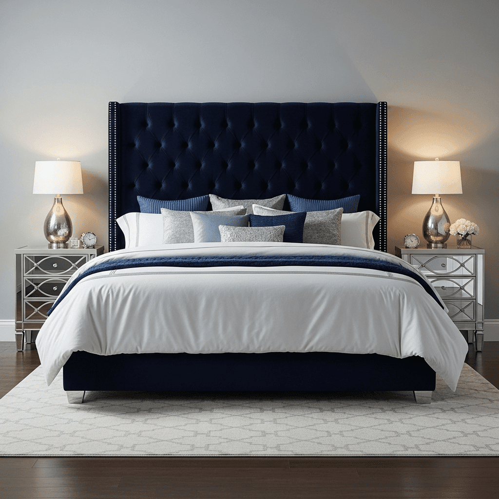 A massive, floor-to-ceiling wingback headboard in plush velvet serves as a dramatic architectural anchor. It provides a sense of enclosure and grandeur, making the bed feel like a royal centerpiece.