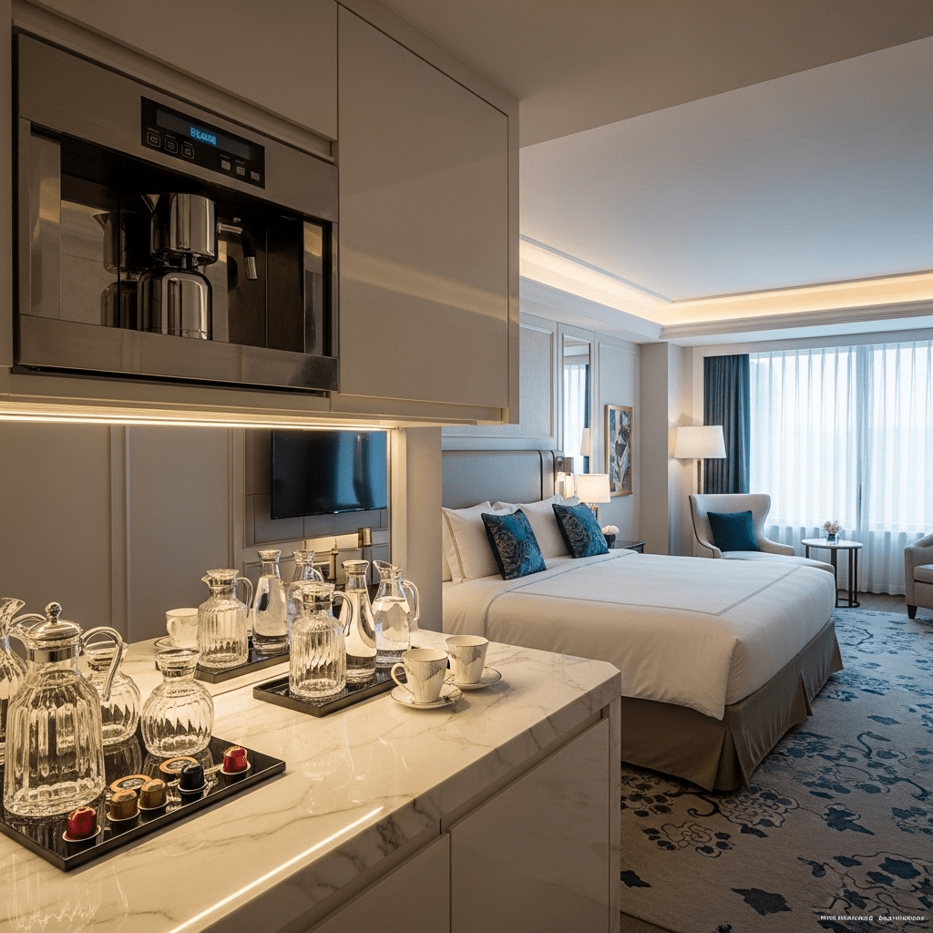 True luxury is never having to leave the room. Install a sleek, built-in refreshment station featuring a high-end espresso machine, a hidden mini-fridge for champagne, and custom glassware.