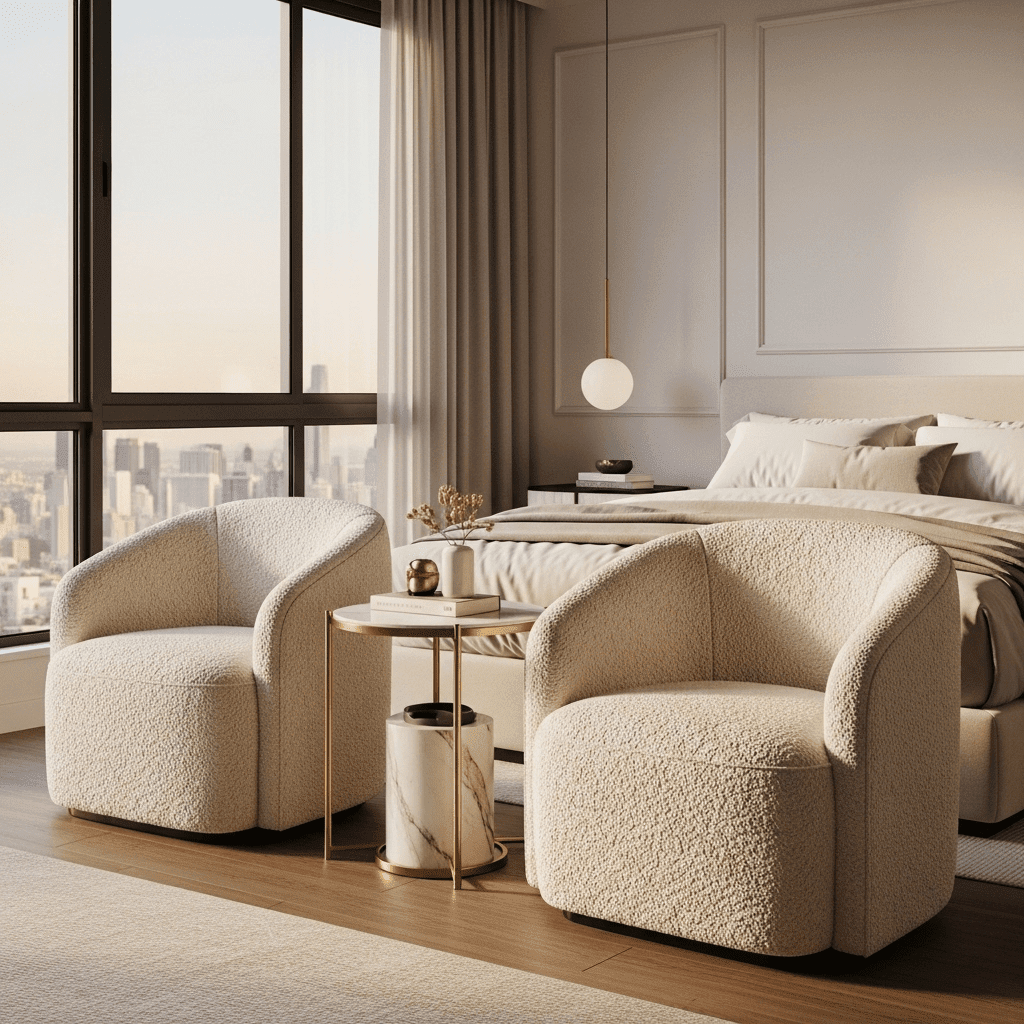 A luxury suite needs a place to lounge that isn’t the bed. Incorporate a pair of designer swivel chairs and a small marble side table to create a private morning coffee or reading nook.