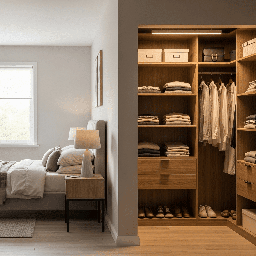 If space allows, convert a standard closet into a custom walk-in dressing room with soft-close drawers, glass-front cabinets, and integrated LED lighting for guest belongings.