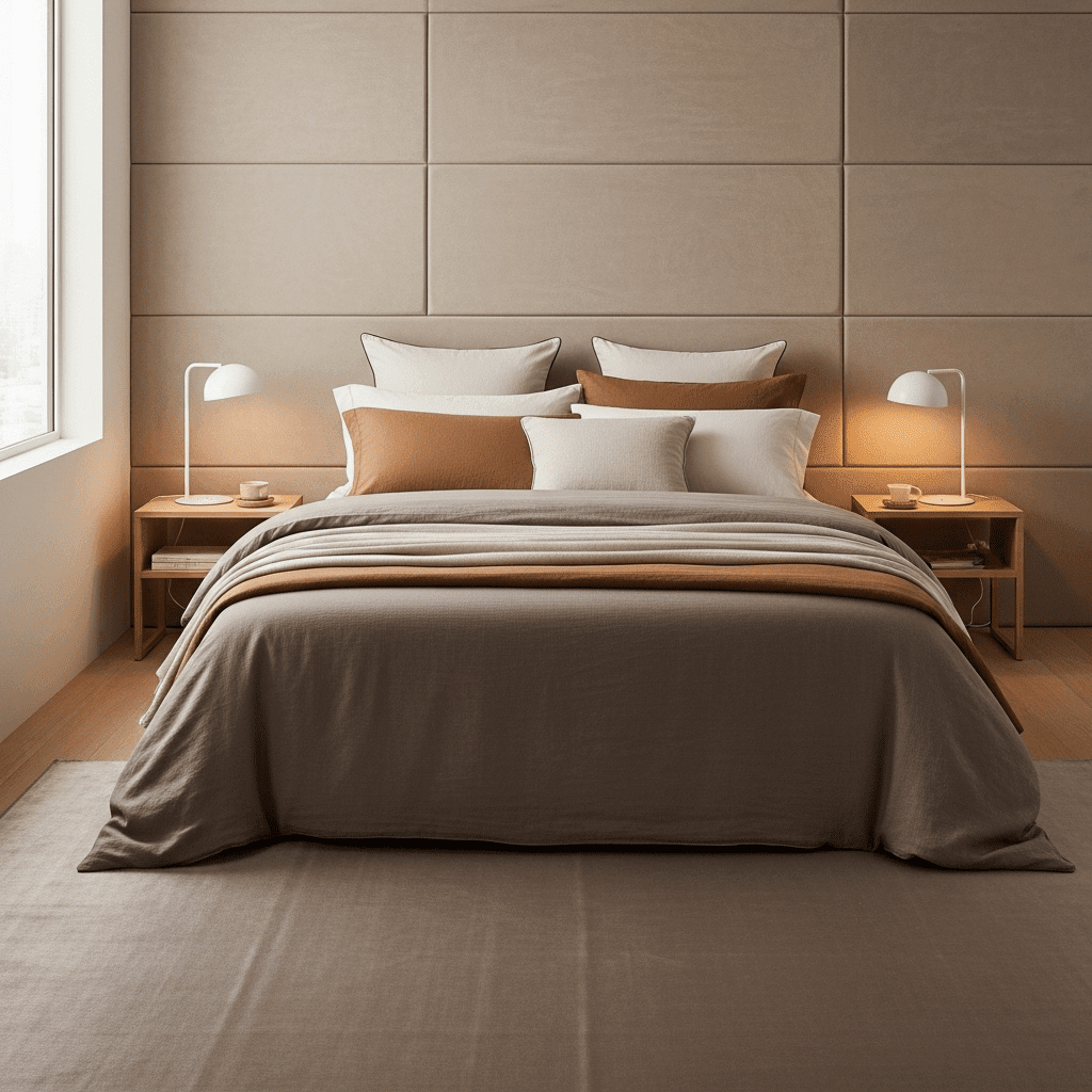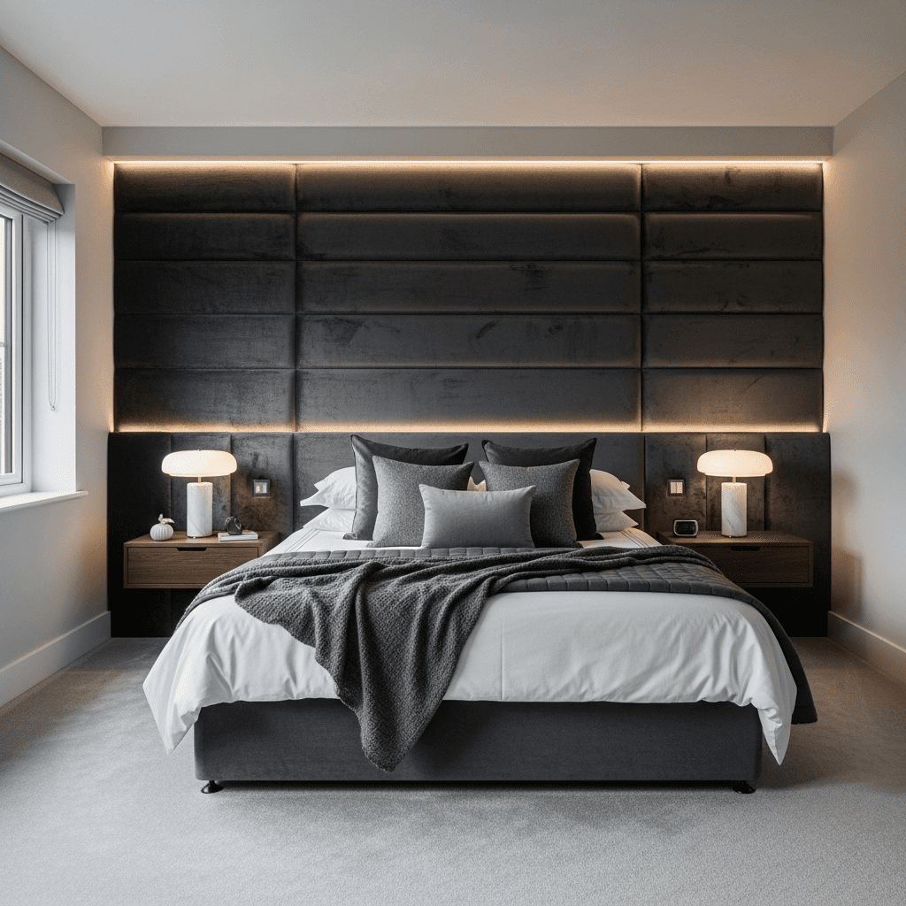 Extend the headboard horizontally across the entire width of the room. Using oversized upholstered panels in a rich fabric like velvet creates a soft, plush backdrop that makes the entire room feel like a high-end hotel.