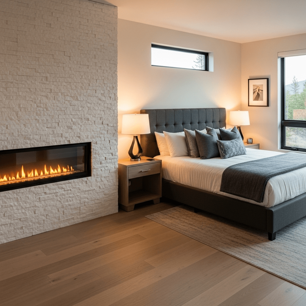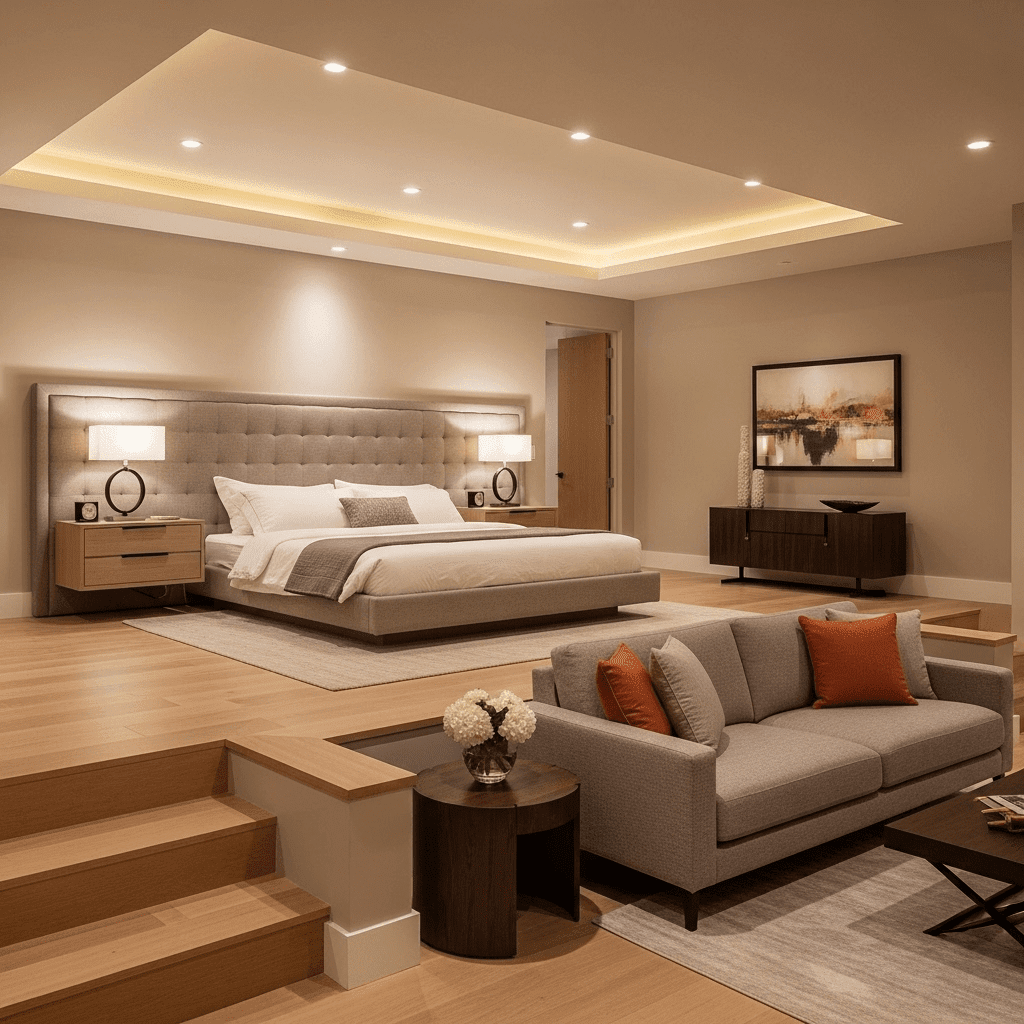 Incorporate a multi-level floor plan by adding a sunken seating area or “conversation pit” near a fireplace or window. This adds architectural depth and provides a dedicated zone for relaxation that is separate from the sleeping area.