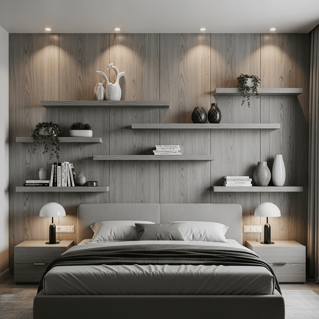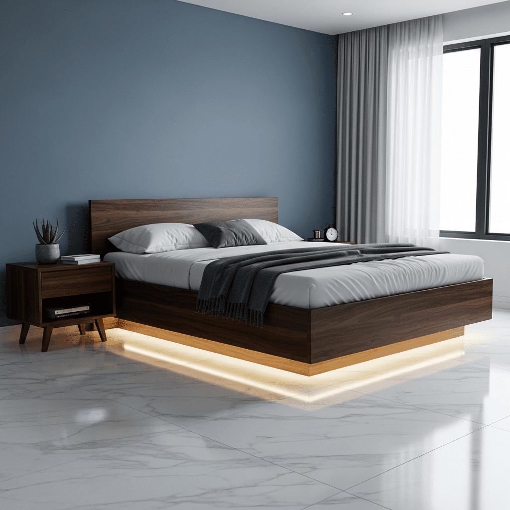 A staple of modern high-end design, the cantilevered bed uses a recessed base to create the illusion of weightlessness. When paired with hidden LED strips along the “toe-kick,” it provides a soft, ambient glow that makes the bed appear to hover over the floor.