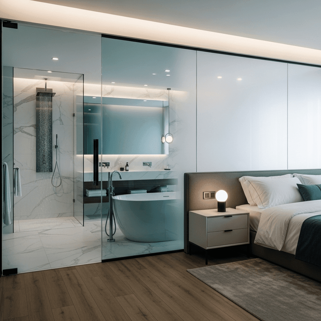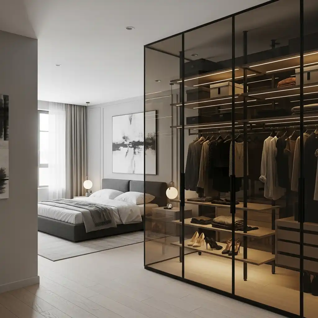 In modern luxury design, the closet is no longer hidden. Using smoked or tinted glass partitions turns your wardrobe into a lighted gallery, making the transition from the bedroom to the dressing area feel like a high-end boutique.