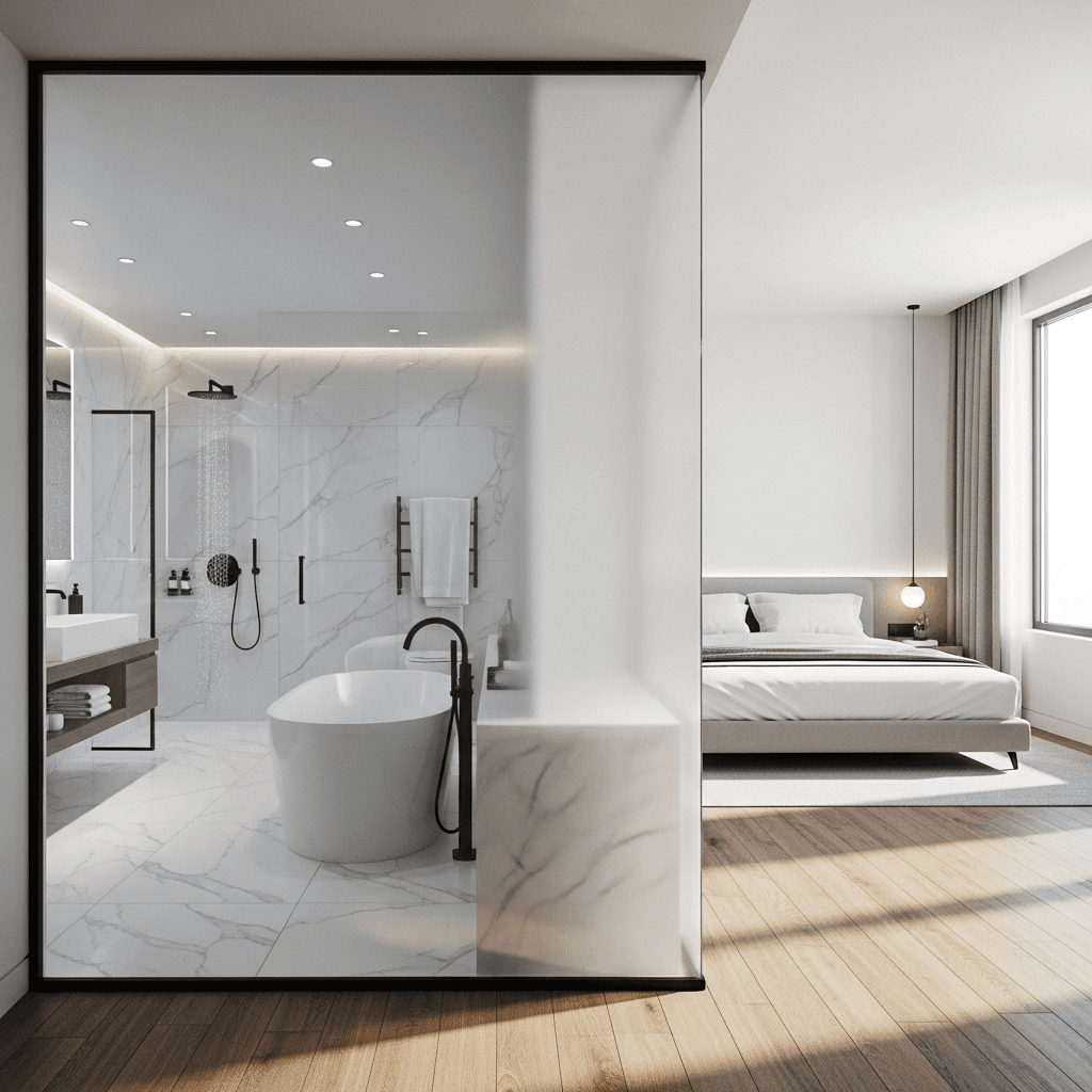 Switchable “smart glass” between the bedroom and the ensuite bathroom offers the best of both worlds. It remains transparent to maintain an open-concept feel but turns opaque instantly at the touch of a button for privacy.