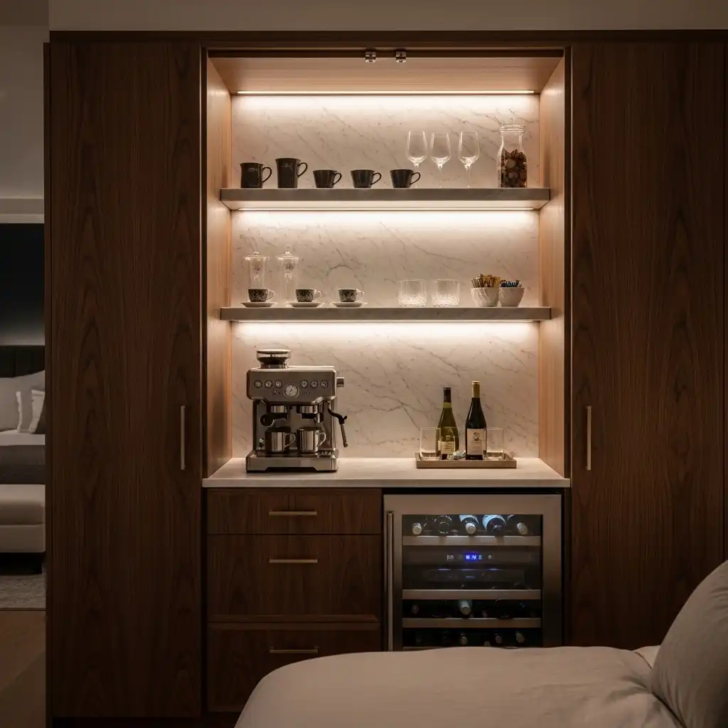 True luxury is about convenience. A modern master suite often features a concealed “midnight bar” with a built-in espresso station, a small wine cooler, and marble shelving, allowing for a private morning coffee or evening drink without leaving the suite.