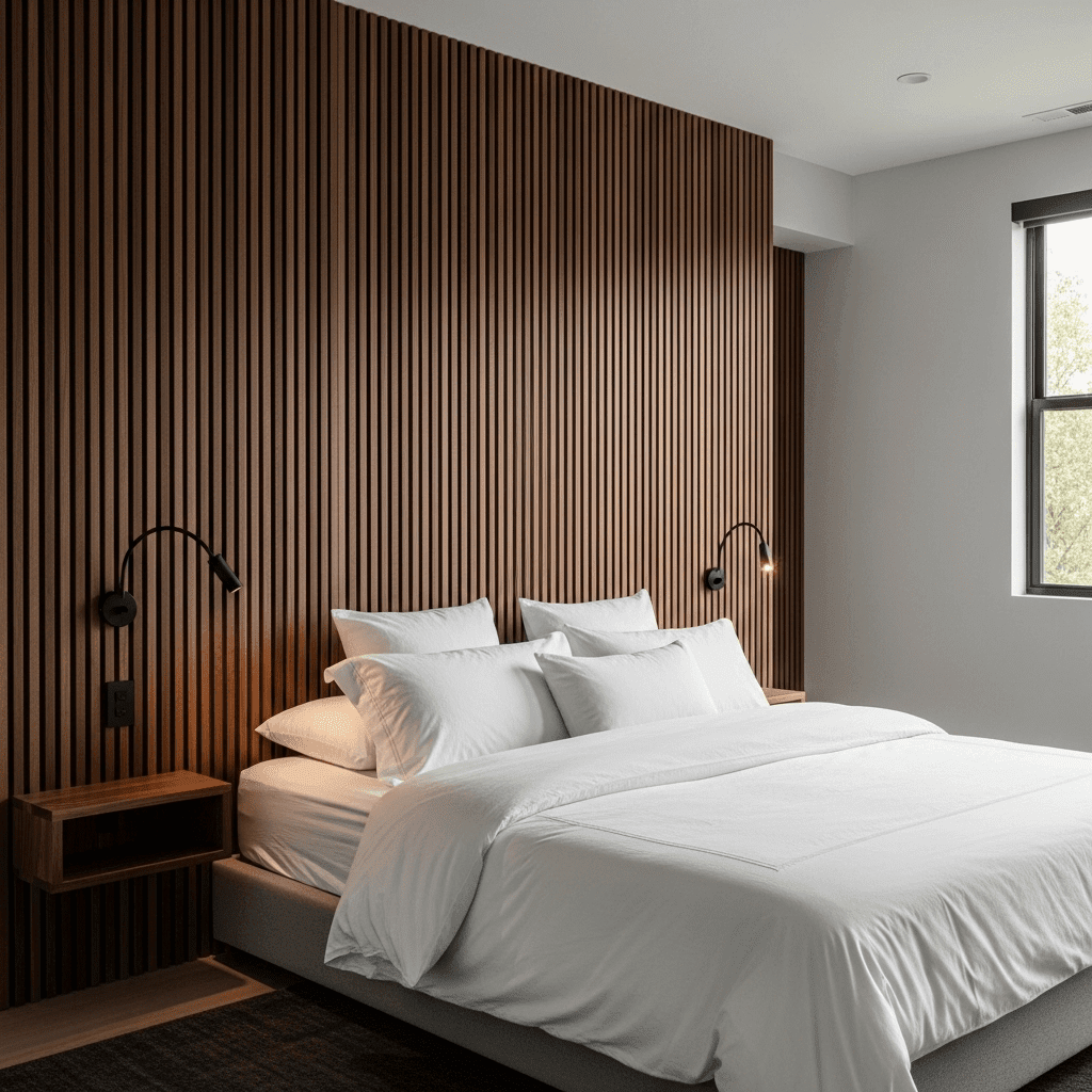Replace a traditional headboard with a full wall of vertical wooden or matte black slats. This architectural feature adds incredible height to the suite and introduces a rhythmic, sophisticated texture that feels both organic and structured.