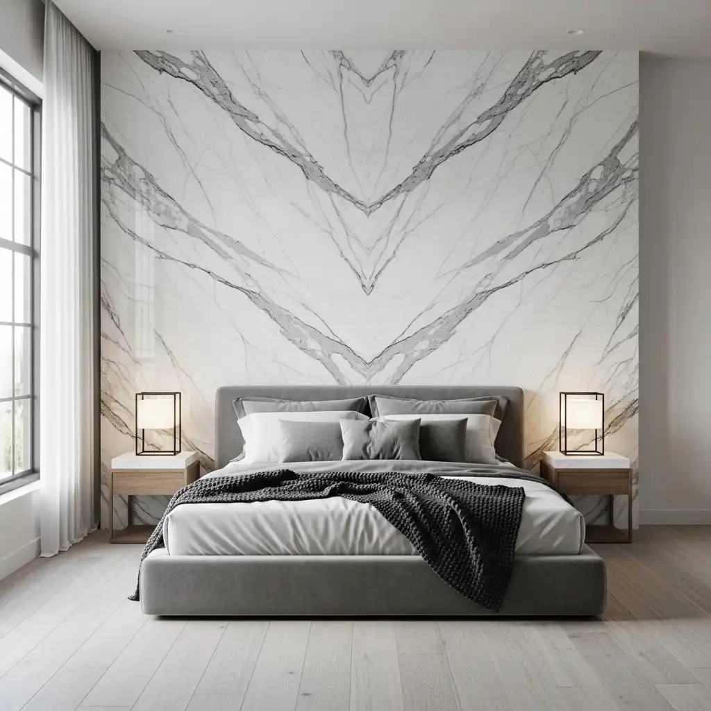 Utilize large-format slabs of book-matched stone—where the veining mirrors itself—to create a dramatic focal point behind the bed. This natural art piece provides a sense of permanence and grandeur that defines “quiet luxury.”