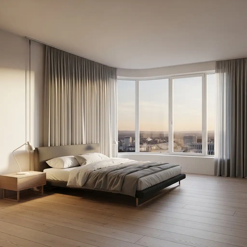 If your master suite has corner windows, use a continuous curved track. This allows the curtains to wrap around the corner seamlessly, providing a cozy “enclosed” feel when the drapes are closed.
