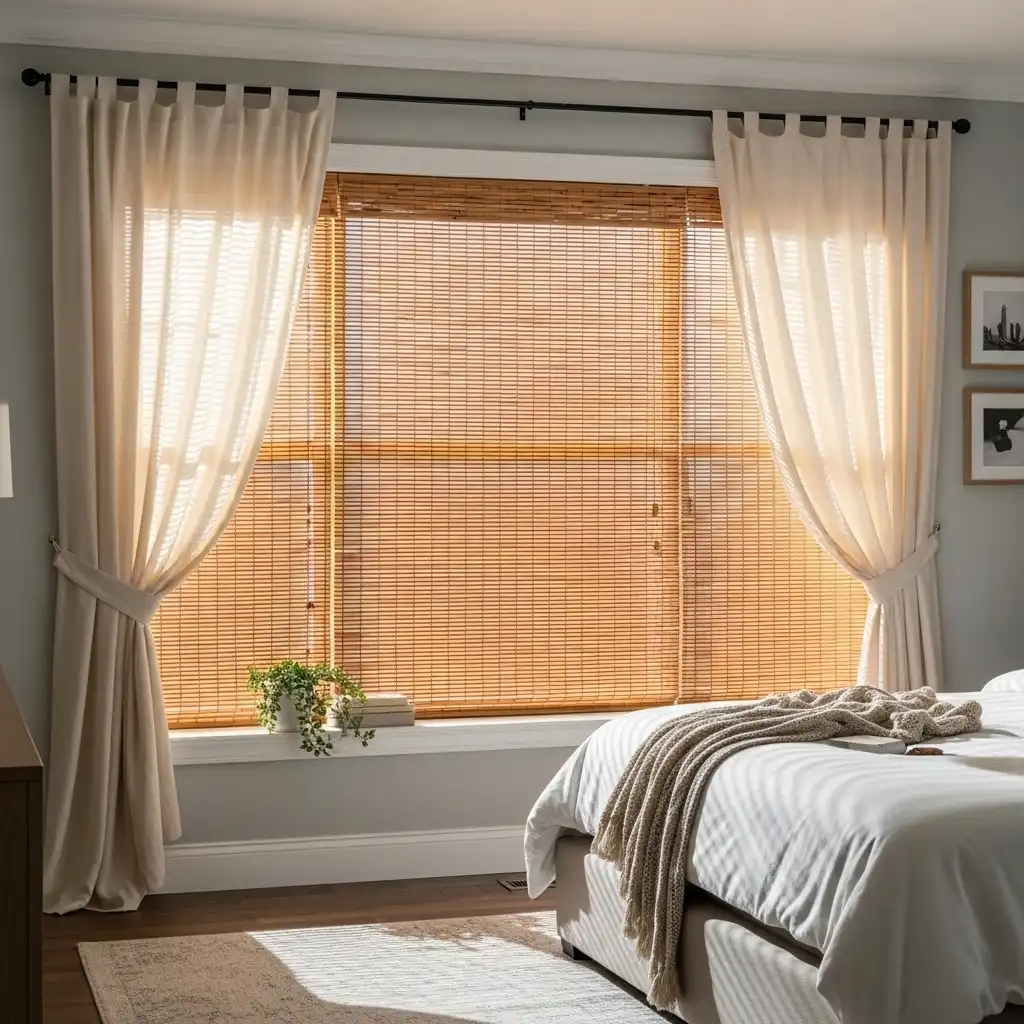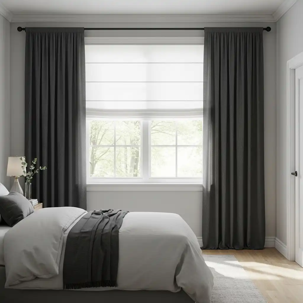 For a layered and “decorated” look, pair a structured Roman shade with stationary curtain panels on the sides. This combination allows you to use the shade for daily light control while the drapes add softness and frame the window beautifully.