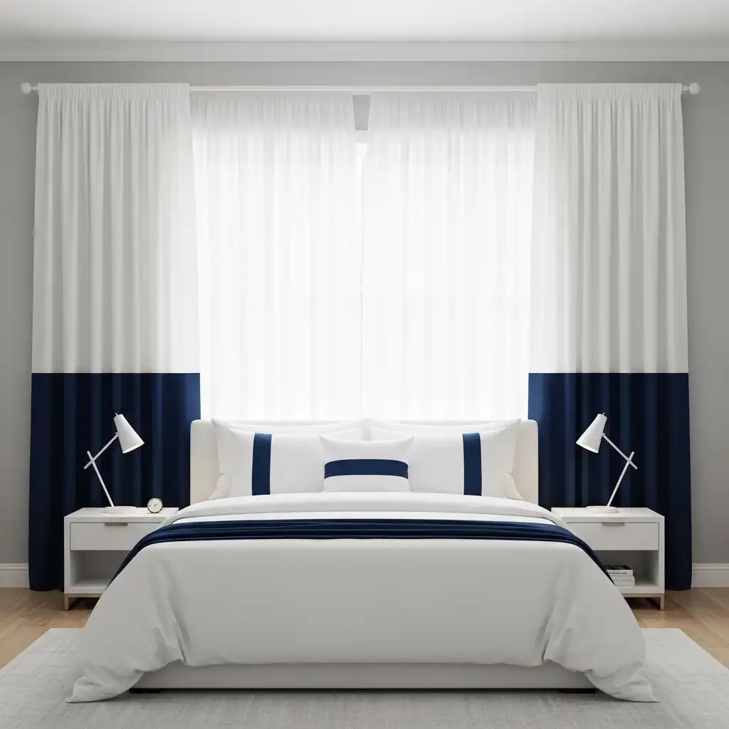 Choose curtains with a “color block” design, where the bottom third of the fabric is a different, darker color than the top. This adds a modern, graphic element that grounds the room’s palette.