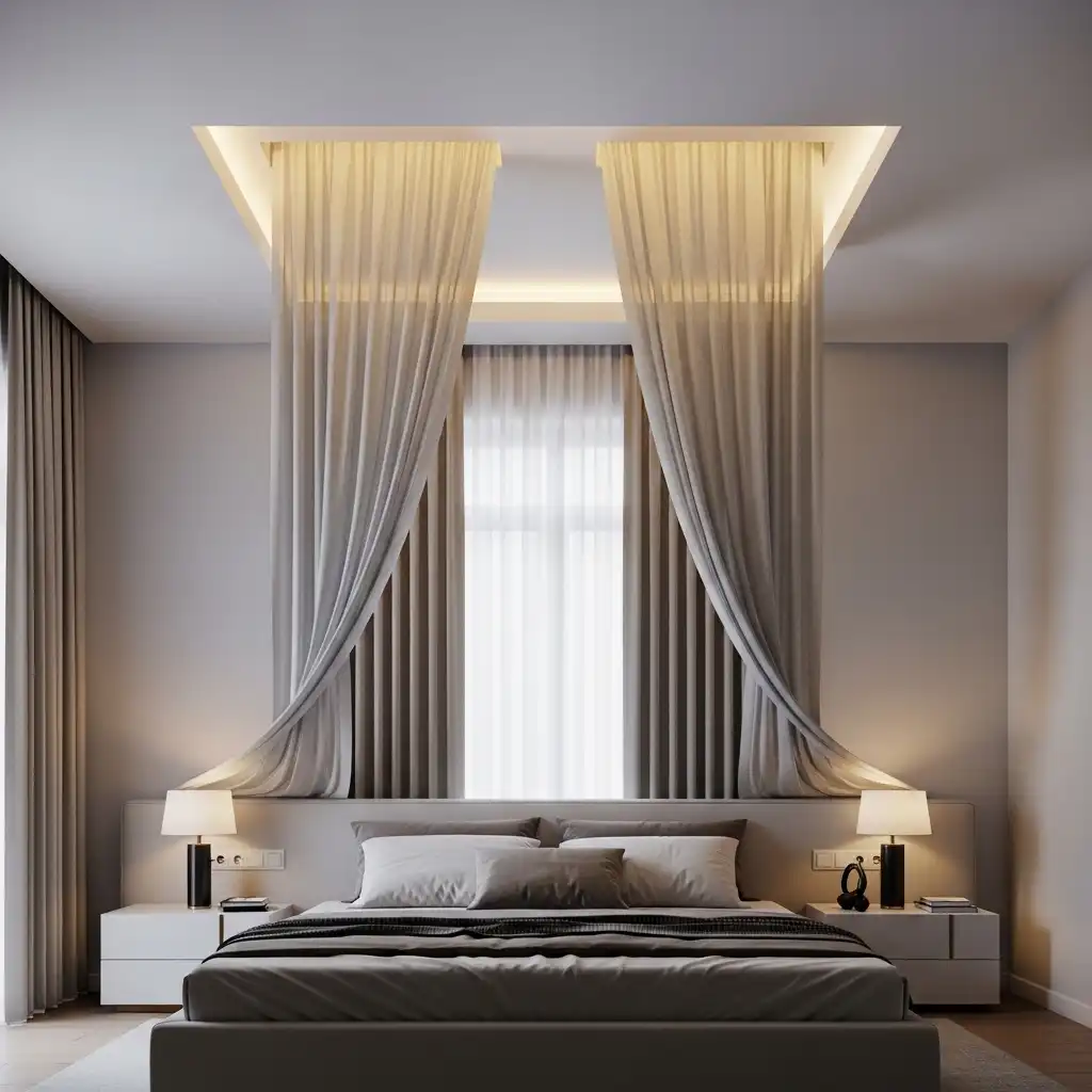 Install a hidden track directly onto the ceiling rather than the wall. This allows the fabric to flow from the very top of the room to the floor, creating an unbroken vertical line that makes any master suite feel significantly taller.