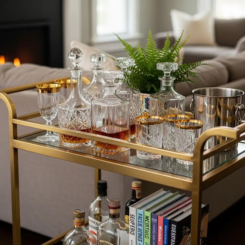 A brass and glass bar cart stocked with vintage glassware is the perfect accessory for MCM entertaining. It adds a touch of “Mad Men” glamour to any corner.