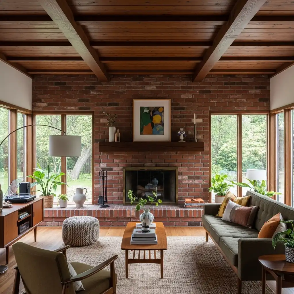 Pair a raw brick fireplace with exposed ceiling beams. This “warm industrial” look provides a rugged backdrop for the polished, sleek furniture of the era.